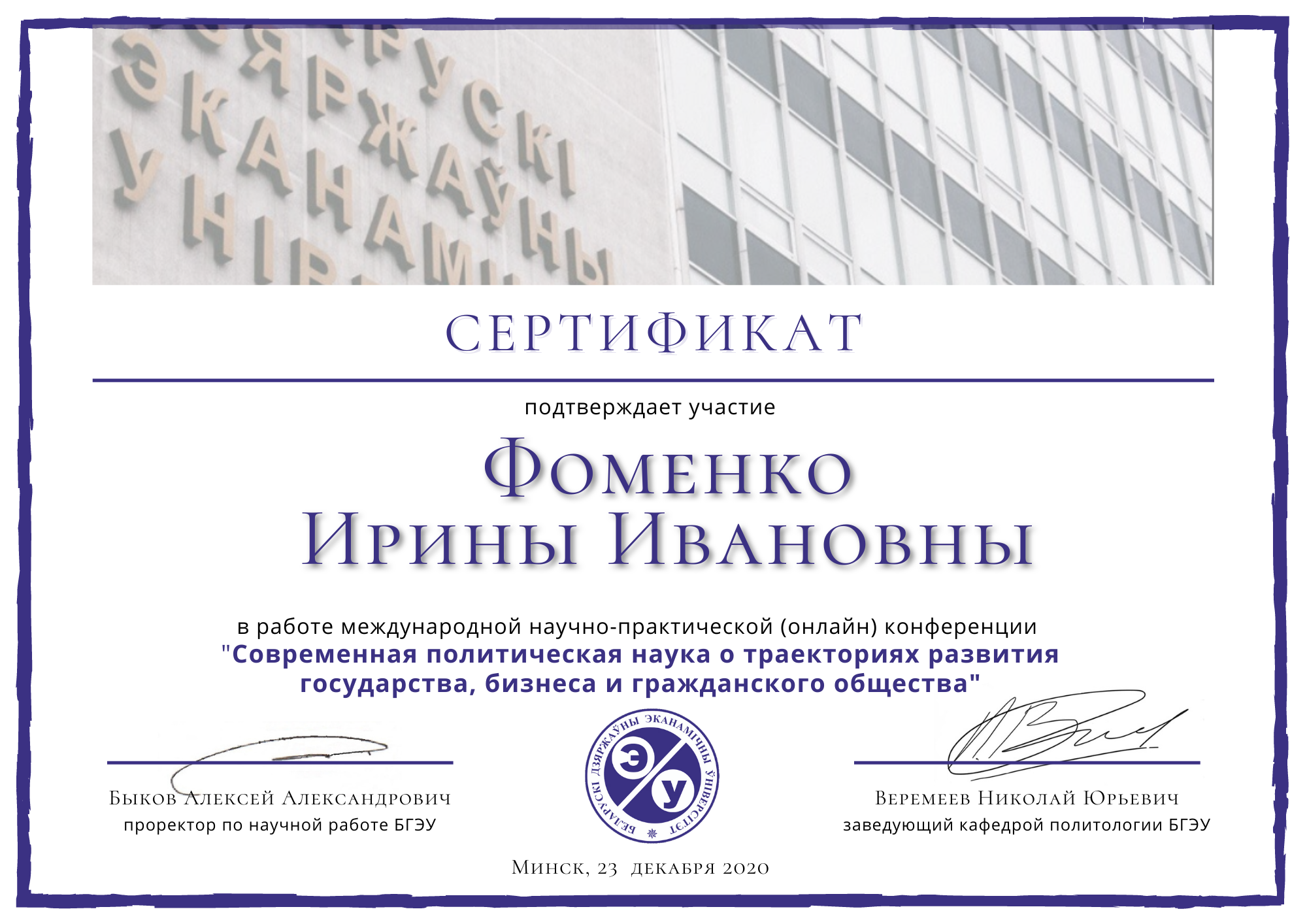 сертификат Международная научно-практическая онлайн-конференция 23.12.2020 г. Минск.